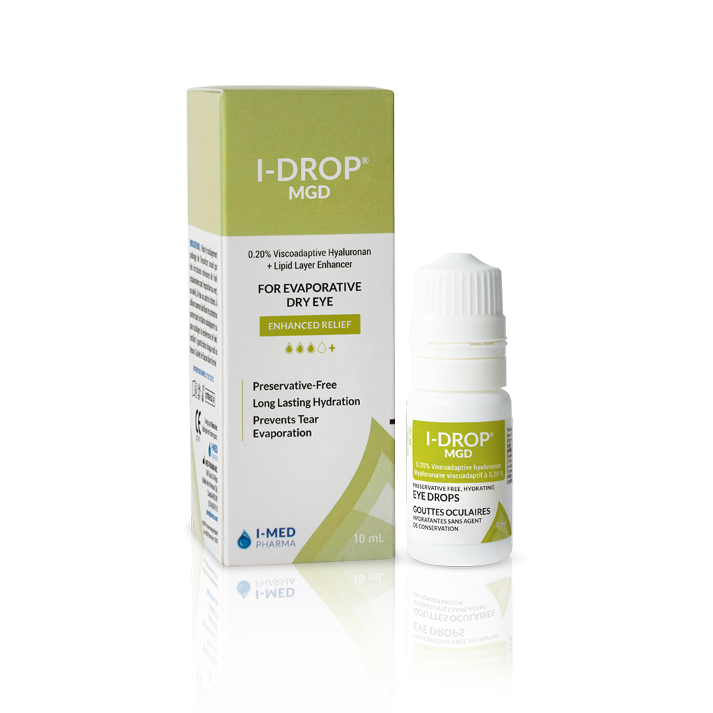 I-DROP MGD is a premium, preservative-free artificial tear formulated with 0.20% viscoadaptive hyaluronan and advanced osmoprotectants and bioprotectants. It stabilizes and enhances the tear film’s lipid layer to reduce evaporation, provide long-lasting hydration, and relieve symptoms of evaporative dry eye with every blink.